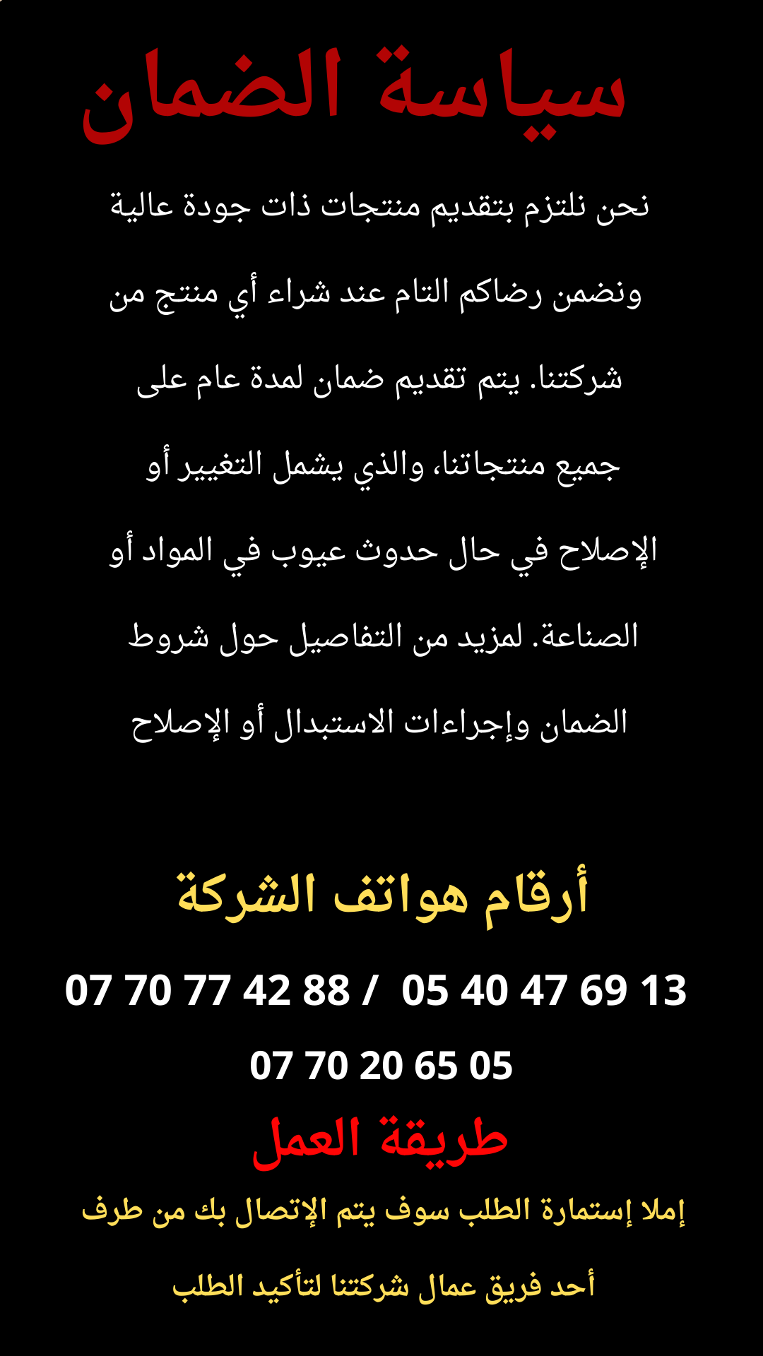 نحن نقدم منتجات دات جودة عالية والأفضل في السوق وفي حالة وجود اي خلل بالمنتج عند وصوله إليك نحن نقوم بتصليح او إستبدال المنتج